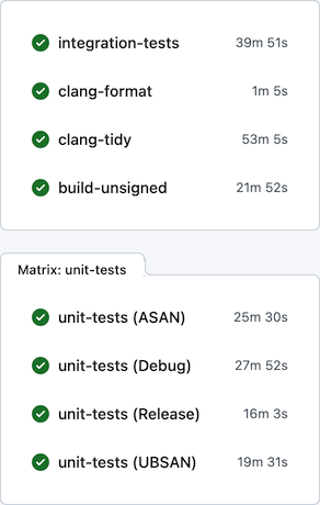 Generally, I find macOS to be a rather hostile platform for developers (but amazing for users), where just keeping up to date with the constant streak of changes requires a lot of effort. Multiplied by other oddities of the ecosystem, maintenance becomes rather tedious. For example, the “clang-tidy” CI job has to first build all targets via xcodebuild, eavesdropping on the compiler invocations, manually clean the Xcode-specific arguments, and only after all that acrobatics actually execute clang-tidy. Another example of the oddities that make the CI so slow: the “integration-tests” job has to run its Docker containers backed by full QEMU emulation (sloooow), since Apple Silicon didn’t allow nested virtualization up until M3 which is still unavailable on GitHub’s runners.
