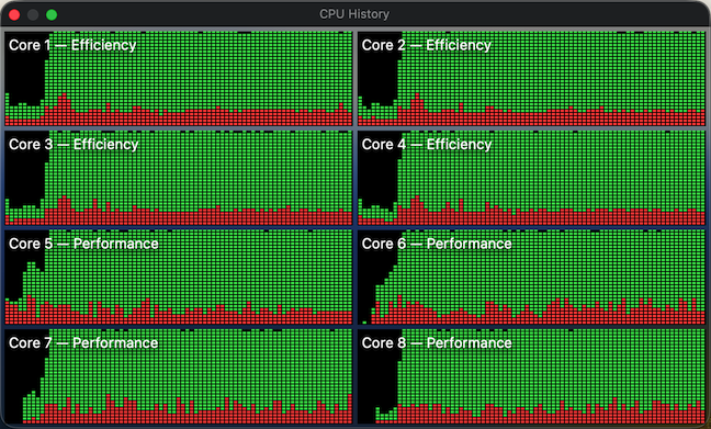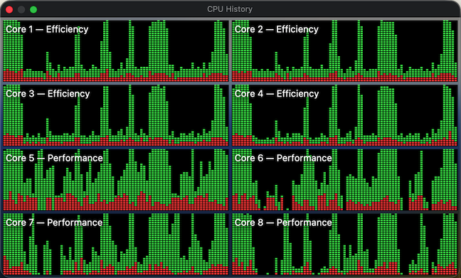 Previously, the scripts that run tests (e.g. “run_all_unit_tests.sh”) tried to do the “right thing”. Targets of the test suites can be identified by their name suffixes (e.g. “UT” for unit tests and “IT” for integration tests), so the scripts asked the build system to provide a list of targets, filtered the list to what they needed, then built those targets one by one and finally ran them. This approach isn’t the most efficient, as it sometimes leaves the build system without enough work to do in parallel. To visualize, here’s how the CPU load previously looked sometimes: